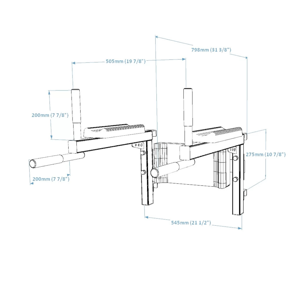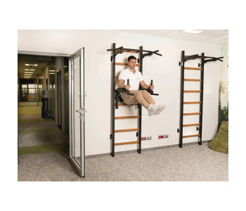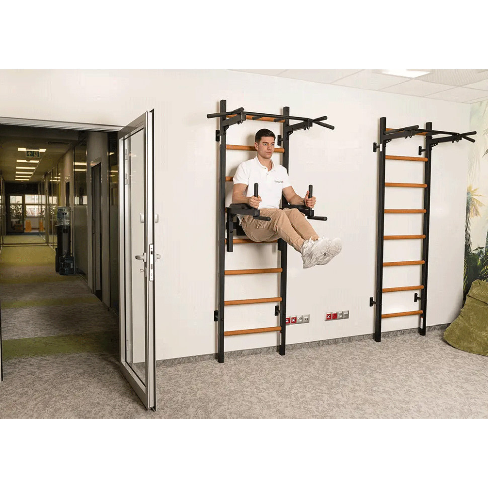 Завдяки знімній конструкції на 4 гачках, бруси можна легко кріпити безпосередньо до перекладин стінки та регулювати висоту відповідно до зросту користувача. Фетрова підкладка на гачках запобігає пошкодженню дерев'яних перекладин стінки.