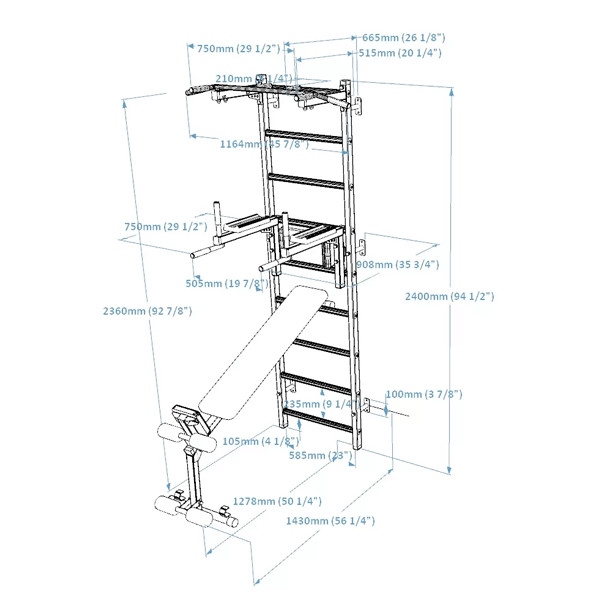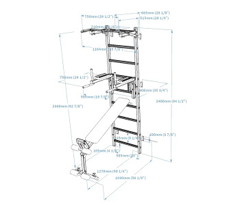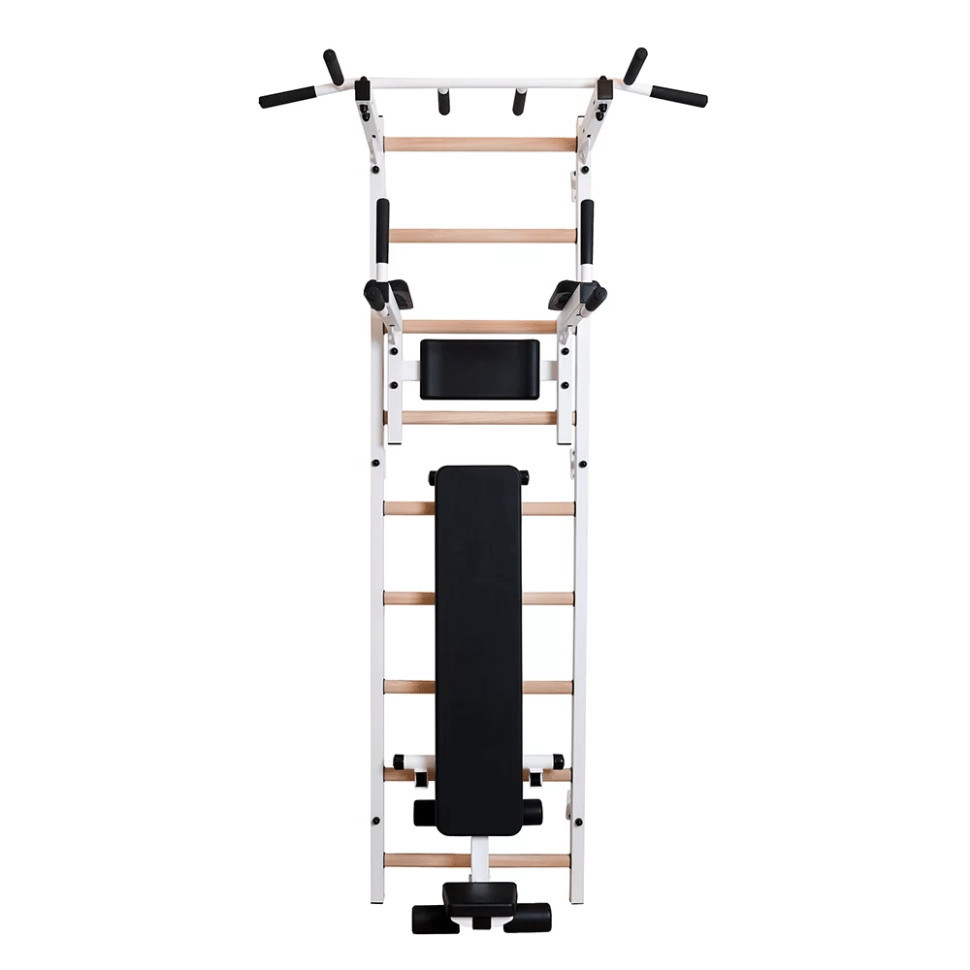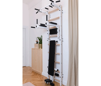 Комплекс включає стінку з 9 буковими сходинками, турнік, бруси для преса/віджимань та універсальну реверсивну лаву B1W. Лава дозволяє виконувати скручування, жим штанги або гантелей під кутом або вертикально, забезпечуючи широкий спектр вправ для всього тіла.