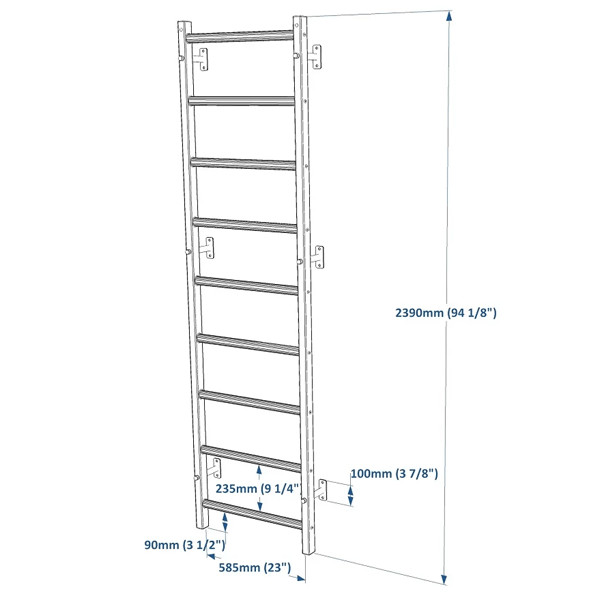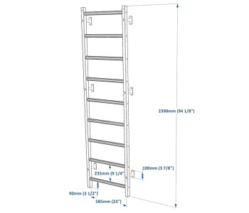 Стінка відповідає європейським стандартам безпеки PN-EN 12346:2001 та PN-EN 913:2019-03. При вазі всього 20 кг та компактних розмірах (10 × 67 × 239 см), вона є надійною основою для розширення додатковими елементами (турнік, бруси, лава).