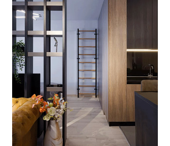Поєднання чорного матового металу та букового дерева створює мінімалістичний та елегантний вигляд. Кожен овальний отвір у профілі має пластикову втулку для покращення естетики та захисту деревини від пошкоджень.