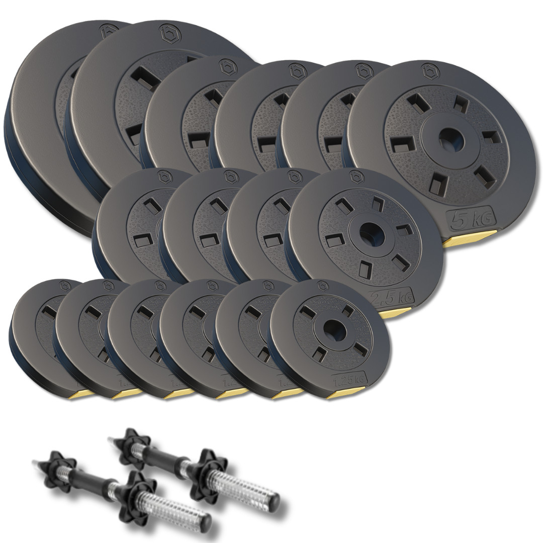 ⚖️ Регульоване навантаження: Включає диски чотирьох вагових категорій (1,25кг, 2,5кг, 5кг, 10кг) та два грифи по 45см, дозволяючи плавно збільшувати вагу та адаптувати тренування до вашого прогресу.