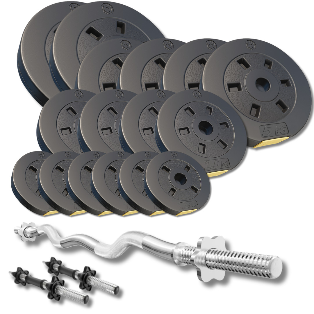 🏋️ Максимальне навантаження та різноманітність: Комплект загальною вагою 66 кг з легкістю дозволить підібрати оптимальне відягаження як для новачків, так і для досвідчених спортсменів, забезпечуючи прогрес у тренуваннях.