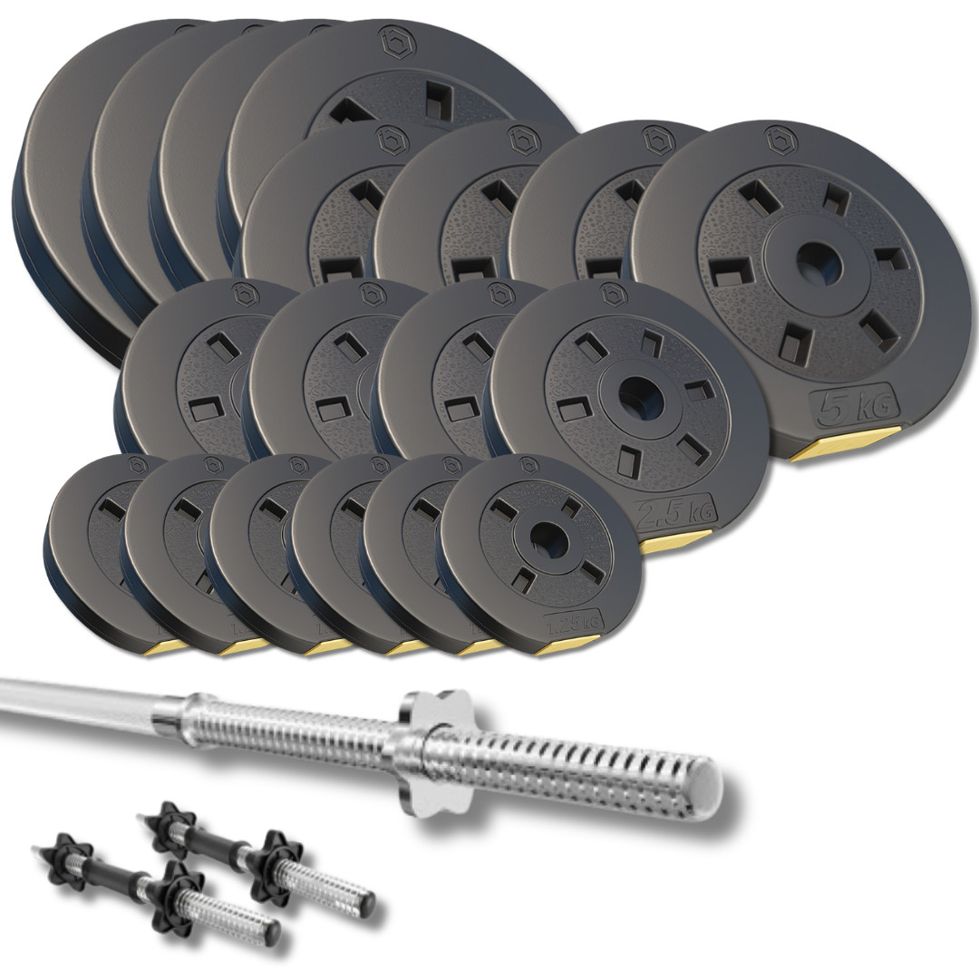🏋️ Універсальність 2-в-1: Забудь про необхідність купувати окреме обладнання! Цей набір легко трансформується зі штанги в гантелі, дозволяючи виконувати сотні вправ на всі групи м'язів.