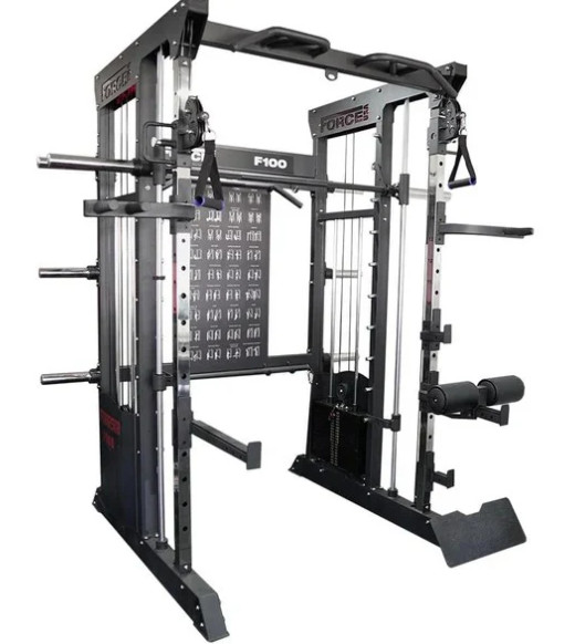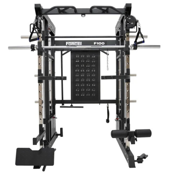 F100 замінює цілий парк обладнання: 1) Машина Сміта (до 300 кг), 2) Силова рама (Power Rack), 3) Тросова система (2:1), 4) Станція для підтягувань/брусів, 5) Насадка для Т-тяги. Це ідеальний інструмент для понад 400 силових та функціональних вправ.