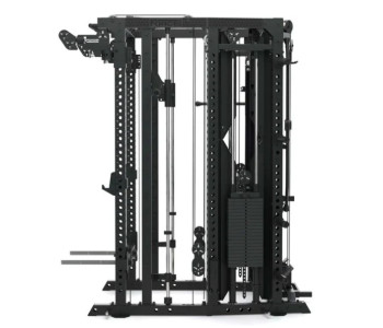C20 інтегрує: 1) Напівраму, 2) Машину Сміта (комерційного класу), 3) Шестиблокову систему (2×91 кг), 4) Станцію для підтягувань, 5) Станцію для брусів/віджимань, 6) Тренажер для кора (Т-тяга), 7) Кріплення для TRX. Це ідеально для будь-якої комерційної програми.