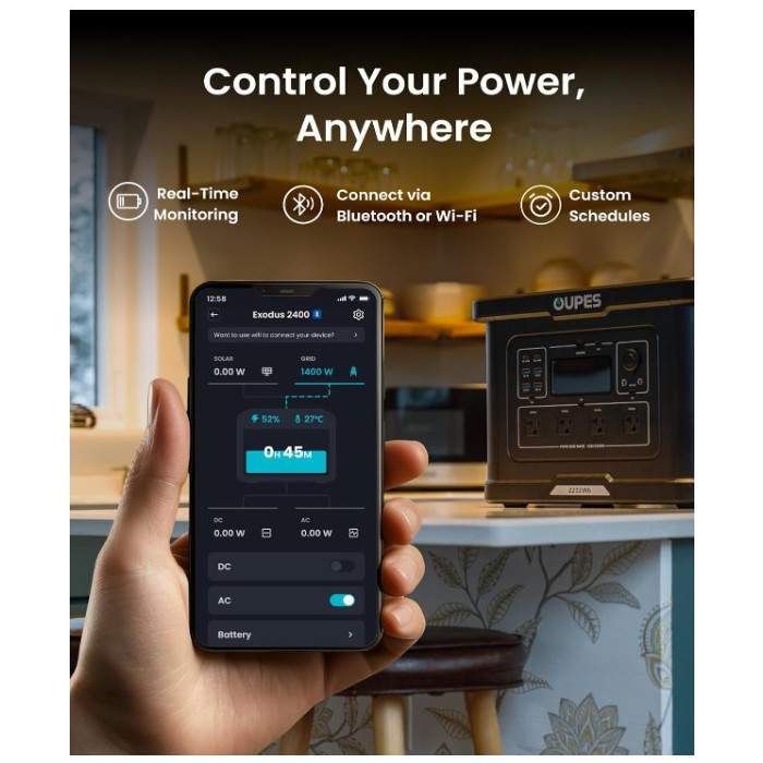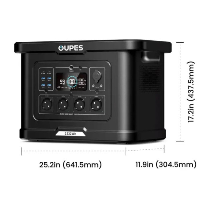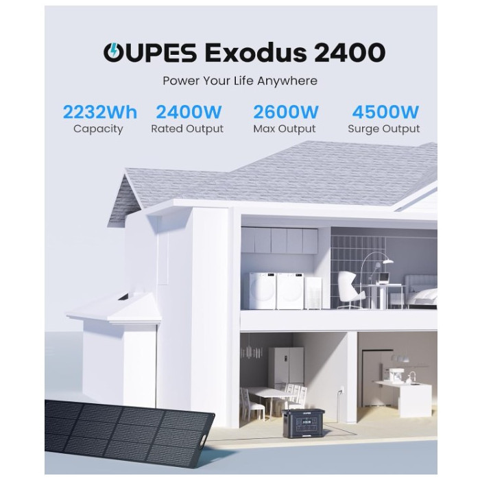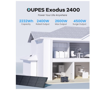 Потребуєте незалежного та надзвичайно надійного джерела живлення для дому, кемпінгу чи професійних потреб? 🥇 OUPES Exodus 2400 — це потужна переносна зарядна станція, оснащена преміальним акумулятором LiFePO4 (літій-залізо-фосфатний), що гарантує довгий термін служби та високу безпеку. З великою ємністю 2232 Вт·год та номінальною потужністю 2400 Вт (пік 4500 Вт), вона легко живить більшість побутових приладів та електроінструментів. Станція підтримує три способи заряджання (від мережі, авто та сонячних панелей до 800 Вт) та функцію заряджання під час використання, забезпечуючи безперебійну роботу. Будьте готові до будь-яких викликів! 🔋