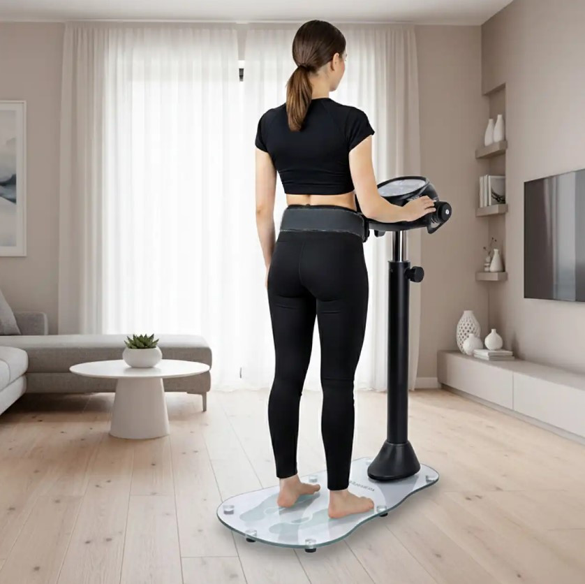 Просто встаньте на стійку скляну основу, увімкніть масаж, і вібрації подбають про ваше тіло: знімуть напругу, стимулюють кровообіг і лімфоток, допомагають у формуванні фігури без додаткових зусиль.
