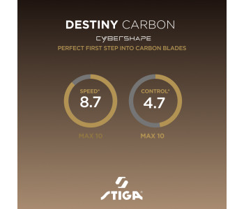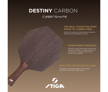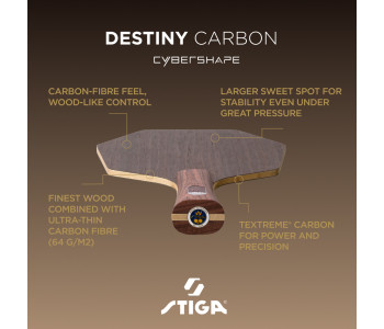 Destiny Carbon Cybershape створена для гравців, які хочуть зробити перехід від класичної дерев’яної основи до карбону, зберігши знайоме відчуття м’яча та високий рівень контролю. Збалансована конструкція та оптимізована зона оптимального удару (sweet spot) дозволяють зберігати потужність, контроль і точність як у грі біля столу на блоці, так і при вирішальних топспінах з дистанції. Destiny Carbon Cybershape робить наступний крок у розвитку атакувальних основ. Поєднання добірної деревини з ультратонким карбоновим волокном (64 г карбону на м²) забезпечує вибухову швидкість, передбачувану траєкторію м’яча та виняткову стабільність. Унікальна структура карбону TeXtreme® Spread Tow з волокнами, орієнтованими під кутом 90 градусів, зберігає відчуття м'яча й контроль. Destiny Carbon Cybershape — ідеальний варіант для першого знайомства з карбоновими основами.