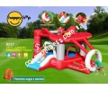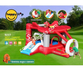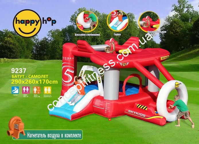 Батут Літак виробника Happy Hop модель 9237 являє собою міні-комплекс, тут передбачено басейн з кульками, гірка для крутого спуску, баскетбольне кільце і нагнітач для повітря. Модель вражає своїм дизайном, красою і небувалим стилем, не займає багато місця, відмінно вписується в інтер'єр заміського будиночка або дитячого табору. Модель батута виконана з анти розривної, міцного і надійного матеріала.Прижкі, повзання, дитячі ігри на надувному батуті зміцнять дитячий імунітет, зроблять м'язи міцніше, займуть малюків, дозволяючи батькам трохи відволіктися. Батут надувного типу Літак Хеппі Хоп 9237 має масу в 16 кг, витримує навантаження до 135 кг, одночасно можуть грати відразу троє непосид на батуті, модель нагадує форму літака з надувними крильямі.