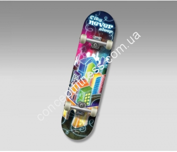 Скейтборд CK Night відрізняється унікальною шелкографией у вигляді нічного міста, немов створений для унікальних трюків і віражів в нічний час року. Модель витримує навантаження до 100 кг, а інтенсивна і швидкісна їзда, стануть для вас нормою. Встановлено хромовані, міцні і безвідмовні підшипники ABEC 3, а поліуретанові колеса з жорсткістю 90А забезпечать плавність ходу без ривків.