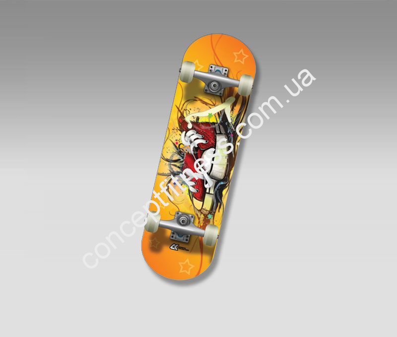 Міні-скейтборд CK Boot Jr витримує навантаження до 80 кг, створений спеціально для юних райдерів, які люблять екстремальну їзду і різні трюки. Підвіска згладжує нерівності на шляху, дека з натурального китайського клена, на неї нанесена яскрава і барвиста шовкографія. Скейт оснащений алюмінієвою, 5 дюймової підвіскою, стандартного типу, здатна справиться з будь-якими нерівностями на своєму шляху, модель невеликих розмірів.