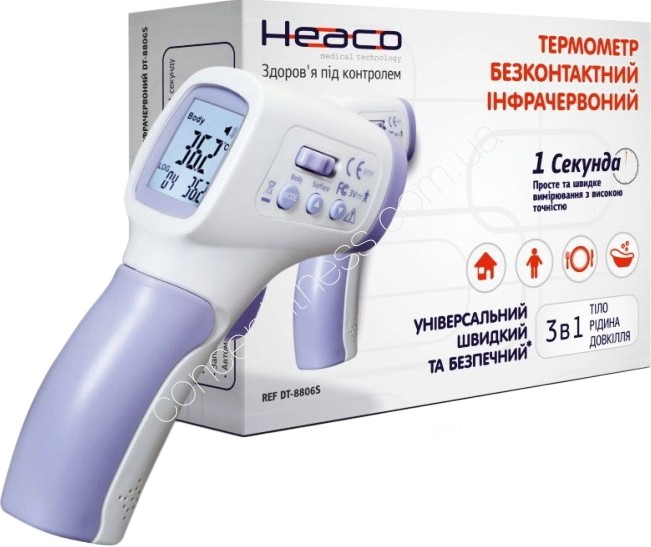 Пропонуємо безконтактний термометр Heaco DT-8806S, який може вимірювати температурний режим тіла пацієнта, повітря і предмета протягом 0,5-1,0 секунди на відстані від 5 до 15 см. Модель Хейко поставляється в чохлі, разом з інструкцією, температурний діапазон виміру від 0 до 60 гр. Прилад оснащений ергономічний ручкою і дисплеєм, куди виводяться результати дослідження.