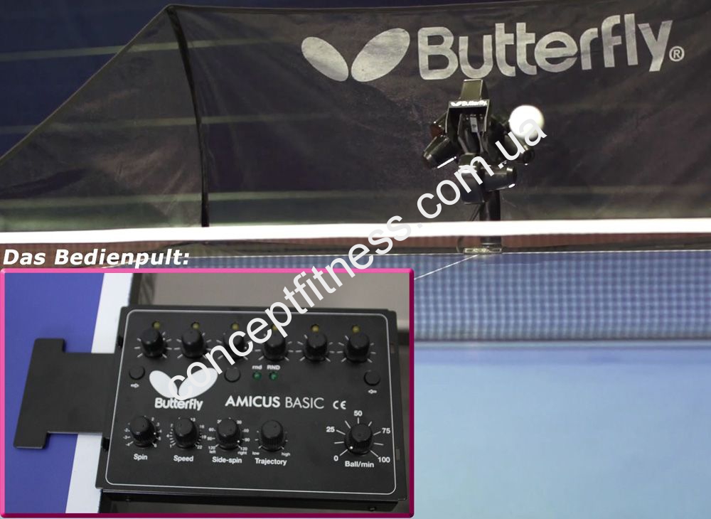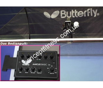 Гармата Butterfly Amicus Basic представлена в чорному кольорі, загальна вага становить 6 кг, існує можливість збереження до 22-х різних комбінацій вильоту кульки. Модель оснащена опціями обертання, швидкості вильоту кульки, траєкторії і місця для тенісного м'ячика, голову можна відрегулювати по висоті вильоту кульки. Гармата Батерфляй Amicus Basic замінить ідеального і витривалого партнера для інтенсивних тренувань, допоможе розвинути реакцію, підготуватися до відповідальних поєдинків і здобути перемогу. Модель виділяється наявністю функції розсіювання настільних м'ячиків. Під час простою не видає зайвих звуків, може викидати більше 100 куль в мінуту.
