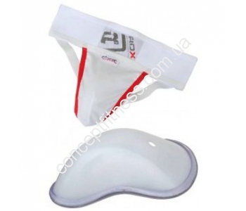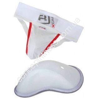 Захист паху RDX Groin Guard представлена в білому кольорі, виготовляється з міцного, якісного пластику і нейлону для поліпшення фіксації. Нейлоновий пояс добре чиститься, легко стирається, на нього нанесений логотип спортивного бренду. Виріб пройшов повну екологічну перевірку, є необхідні сертифікати якості та відповідності, що підтверджує повну відповідність нормам боротьби та боксу. Захист паху РДХ Groin Guard покликана захистити життєво важливі точки борців, боксерів від різних ударів і захоплень. Модель нагадує ванночку, куди ховається пах бійця, вельми актуально при інтенсивному спарингу. Захист виправдала себе в багатьох турнірах, зібрала сотні тисяч вдячних відгуків з усього міра.