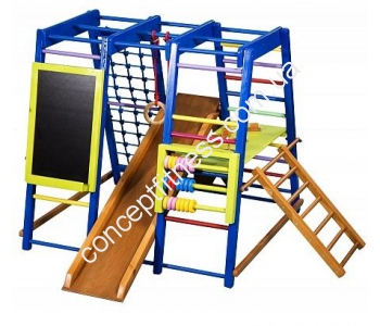 Спортивний комплекс акварельку Sportbaby оснащений гладіаторських сіткою, а також дитячими кільцями, рахунками, дошкою мольберт, вага комплексу становить 30 кг. Модель різнобарвного тону, виконана з масиву сосни, а сволок із благородного бука, легко встановлюється. Комплекс розвиває логіку, швидкість і координацію рухів, спритність, а також зміцнить їх імунітет і підніме тонус.