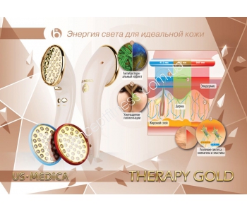 Прилад для фототерапії US Medica Therapy Gold підвищує тонус шкірного покриву, покращує вигляд обличчя, надає йому свіжості, вирівнює рельєфність шкіри. Модель з трьома світловими спектрами, червоний ndash; зміцнює судини, стимулює шкіру до вироблення колагену; синій ndash; бореться з жирною шкірою, повністю імітує ультрафіолетове випромінювання, усуває запальні процеси; зелений ndash; прибирає пігментні освіти в шкірному покриві, паралельно знімає почервоніння і різні роздратування.
