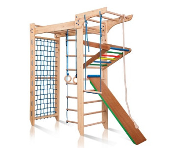 Спортивний комплекс Спортбебі Кіндер 5-220 має вагу 45 кг, витримує 130 кг навантаження користувачів, тому батьки завжди можуть приєднатися до занять і показати дітям кілька фізичних вправ. Комплекс виконаний з легкого, міцного і якісного деревного матеріалу ndash; сосни і бука. Всі дерев'яні деталі просочені антисептиком, який блокує виникнення алергічних реакцій і почервоніння шкірного покриву. Модель доповнить інтер'єр дитячої кімнати або тренажерного залу.