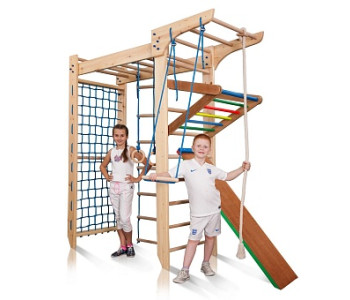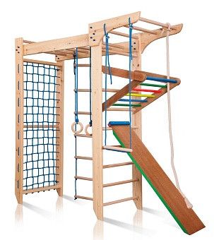 Спортивний комплекс Sportbaby Kinder 5-220 нашпигований по максимуму, а саме турніком зі шведською стінкою, сіткою для гладіаторських боїв, рукоходом, мотузковим канатом, гімнастичними кільцями, піратської сходами, дитячим знімним турником, дошкою для накачування черевного преса і комплектом для кріплення. Куточок дозволяє тренуватися малюкові в будь-який час, крім цього зміцнює м'язи, піднімає настрій, витривалість, загальний тонус організму.