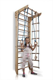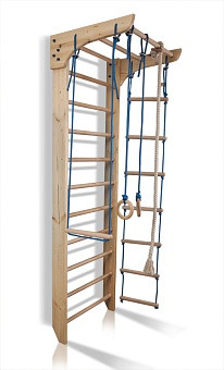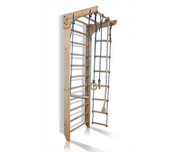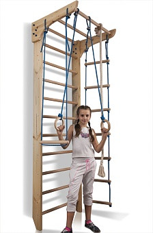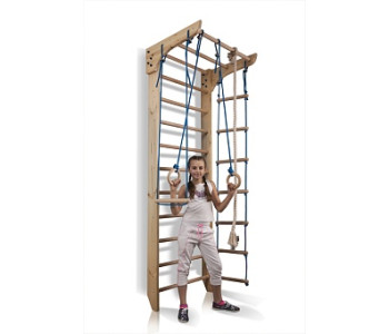 Дитячий спортивний куточок Спортбебі Кіндер 2-240 дозволяє тренуватися малюкові в будь-який час, крім цього зміцнює м'язи, піднімає настрій, витривалість, загальний тонус організму. Комплекс виконаний з легкого, міцного і якісного деревного матеріалу ndash; сосни і бука. Куточок комплектується шведською стінкою, гладким турніком, канатом, трапецією, гімнастичними кільцями для вправ, сходи з мотузок і кріпильних комплектом.