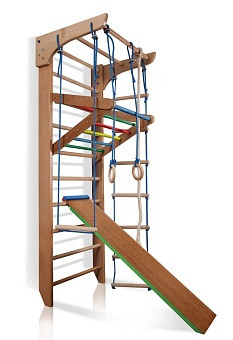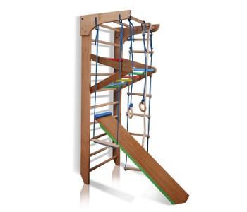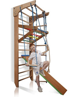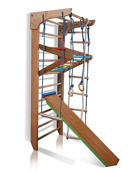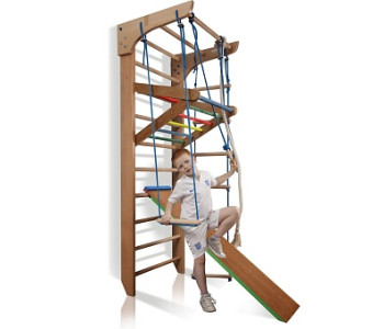 Спортивний куточок Sportbaby Bambino 3-220 оснащений міцною і якісною шведською стінкою, турніком для підтягування, поліпропіленовим канатом, кільцями для гімнастичних вправ, трапецією, піратської сходами, а також комплектом кріплення. Модель витримує 130 кг навантаження, при цьому загальна вага становить 35 кг, гарантія на виріб 12 місяців. Куточок фіксується до стінки, в якості матеріалу виступає легкий, міцний, надійний і безвідмовний бук. Дерев'яні частини куточка покриті універсальним антисептиком, захищає від алергії і подразнень.