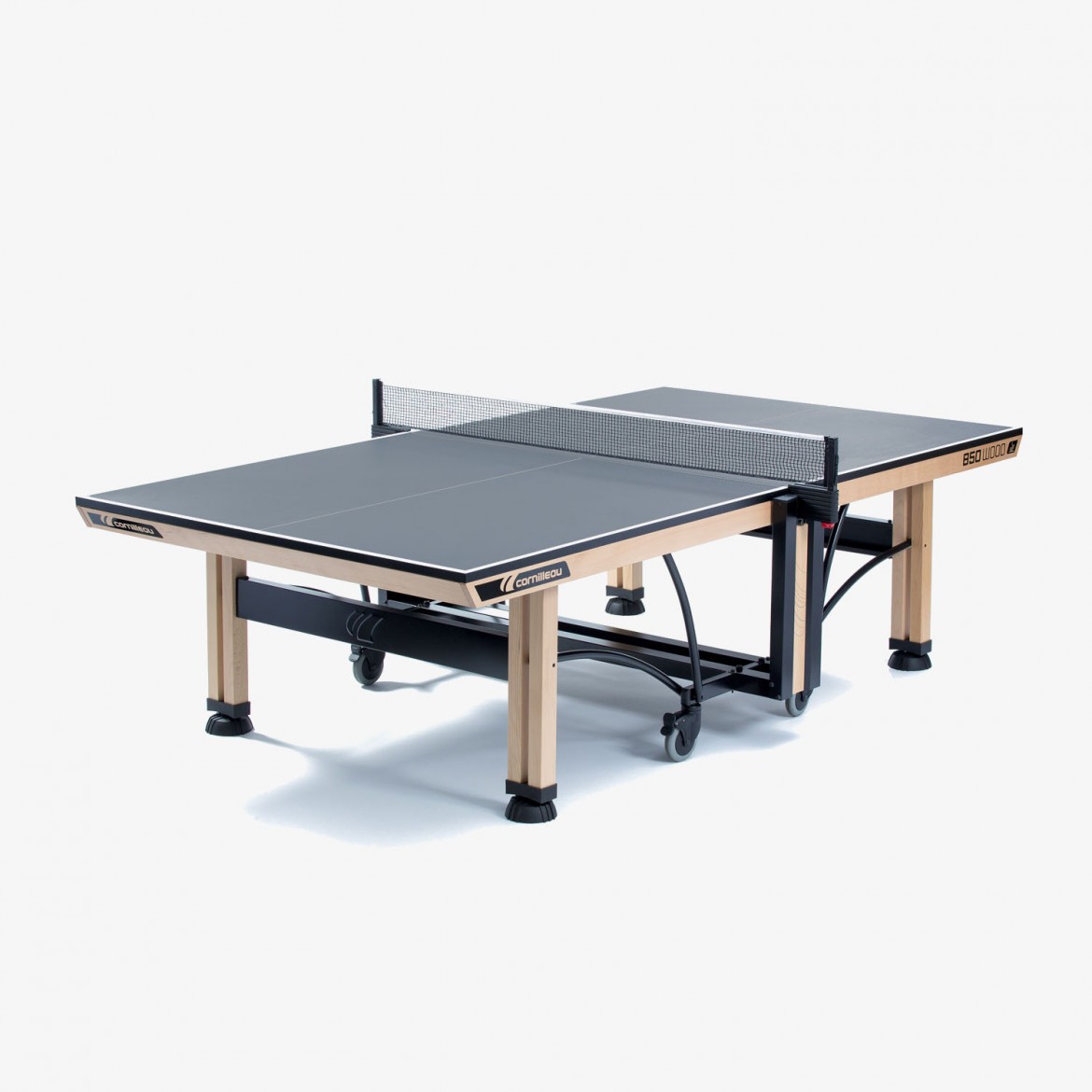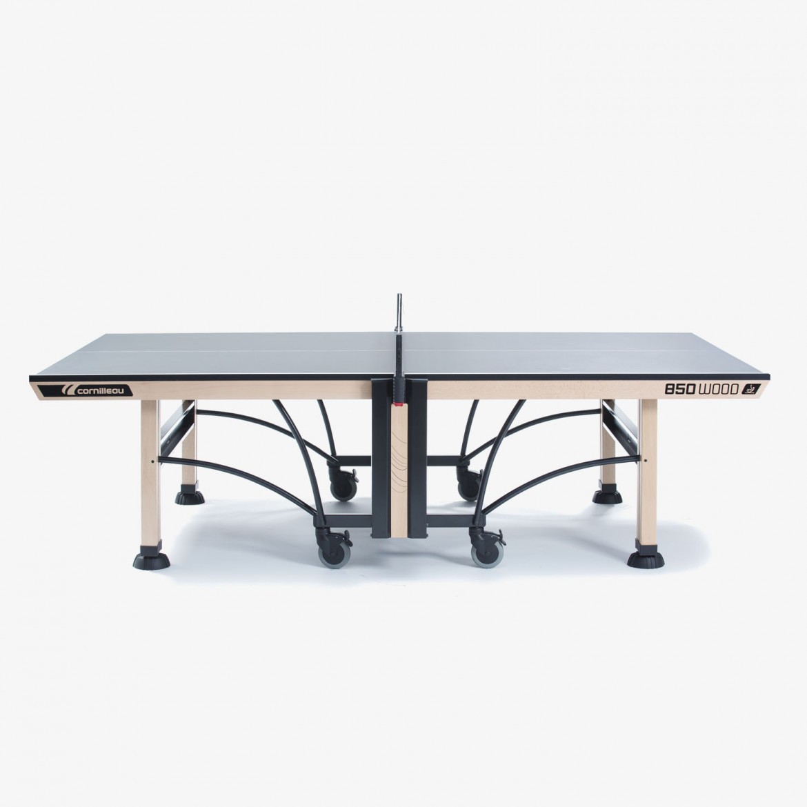 Тенісний стіл Cornilleau Competition 850 Wood ITTF майже на 90% складається з дерева, за винятком частини ніжок і стільниці. Модель фіксується під час гри 4 бічними гальмами, ніжки дерев'яні, з боків залізні вставки для кращого армування, а для стійкості внизу щільні гумові накладки. Стіл пройшов інтенсивні, багатогодинні випробування тенісом, має сертифікат ITT, в комплекті передбачена також натяжна, регульована сітка.Тенісний стіл Competition 850 Wood ITTF від французького бренду Cornilleau виділяється хорошими ігровими якостями, а саме чудовим відскоком і антибликовой поверхнею, представлений в синьому і сірому кольорі. Вага моделі 122 кг, дерев'яна окантовка, стіл розроблений для тренувальних і аматорських ігор всередині приміщень. Товщина стільниці 25 мм, а розмір окантовки 70 мм, при необхідності стіл складається і транспортується на поліуретанових колесіках.