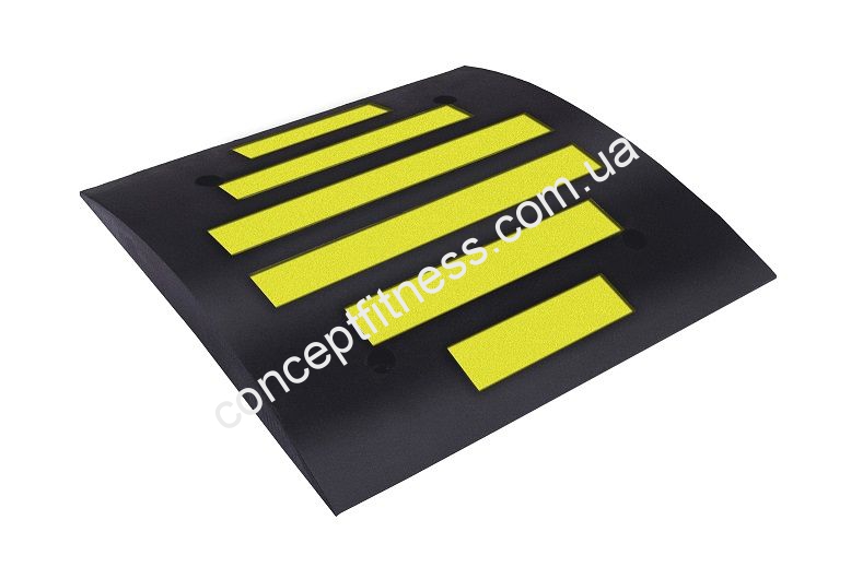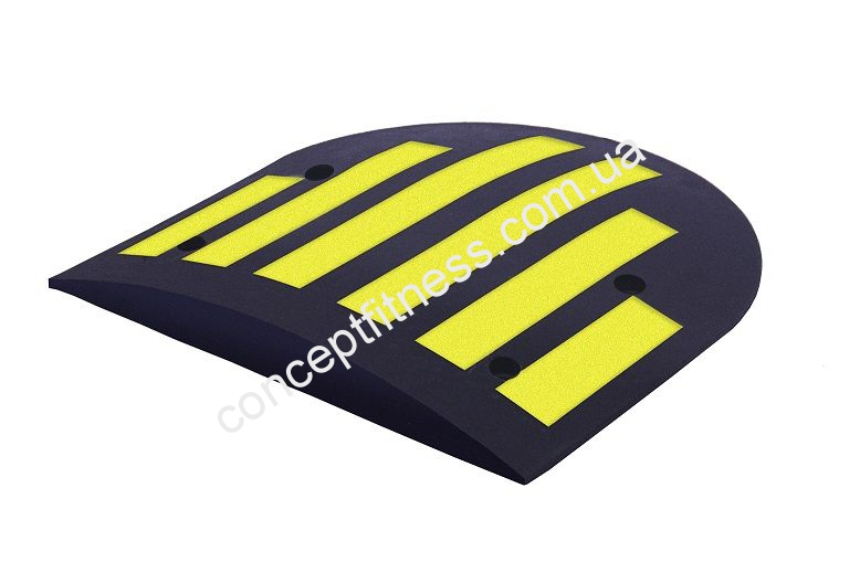 Елемент примусового зниження швидкісного режиму 500х500х50 мм, від бренду УкрГума добре реагує на агресивну дію навколишнього середовища, температурні перепади витримує в межах від -40 до +50 градусів. Пристрій примусового скидання швидкості складається з декількох важливих елементів, воно представлено в чорному кольорі з жовтими смугами. Кріплення лежачого поліцейського відбувається потужними анкерними, сталевими болтами, а також посиленими шайбами. Дана модель встановлюється на дорожнє покриття з активним типом руху, поблизу шкіл, садочків, режимних підприємства та інших державних і приватних установ.