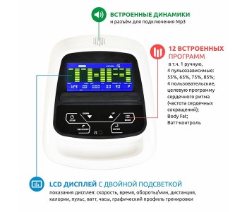 - Показання дисплея: швидкість, час, обертів /хв, дистанція, калорії, пульс, ват, годинник, графічний профіль тренування
