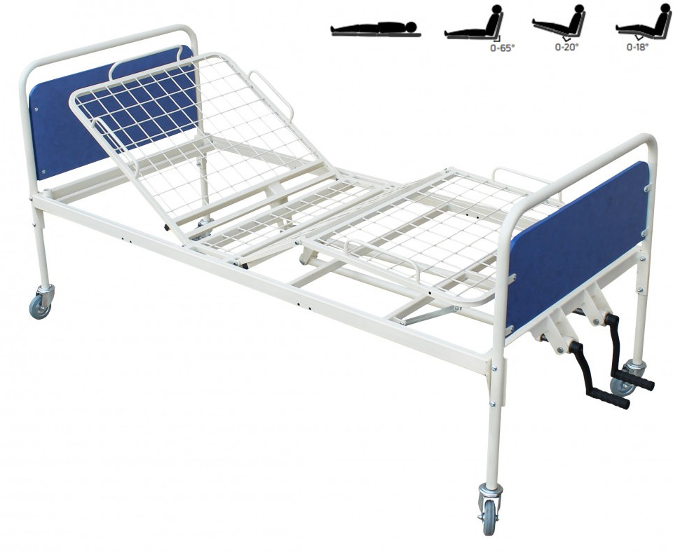 Ліжко функціональне 4-х секційна ЛФ.4.1.3.1.М з механічним регулюванням нахилу секцій, знайде оптимальне положення для хребта пацієнта після складних травм і операцій. Модель полегшує роботу медперсоналу під час різних маніпуляційних і реабілітаційних заходів. Маневрена колісна база з гальмами, дозволяє транспортувати пацієнта з одного палата в іншу, а від зісковзування матраца захищають бічні, широкі бордюри. Ліжко застосовується в домашніх умовах, а також реабілітаційних центрах, лікувальних установах, профілактичних закладах.