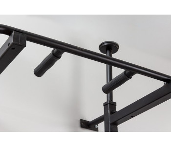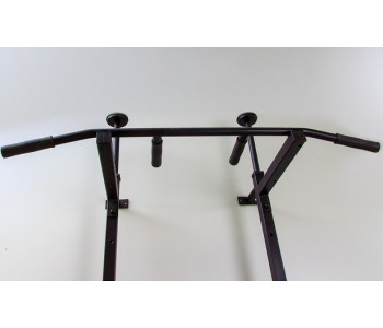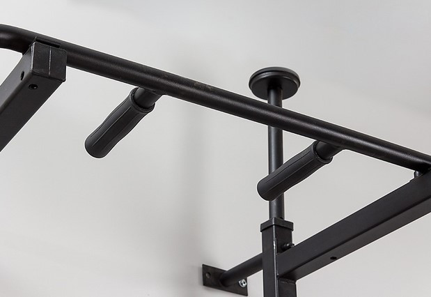 Конструкція передбачає наварені гачки для штанги до 90 кг, а бруси кріпляться через спеціальні напрямні під перекладину. Турнік оснащений ручками з резинопластика, які не ковзають і міцно тримаються завдяки прямому наплавленню на металеву основу — жодних прокручувань.