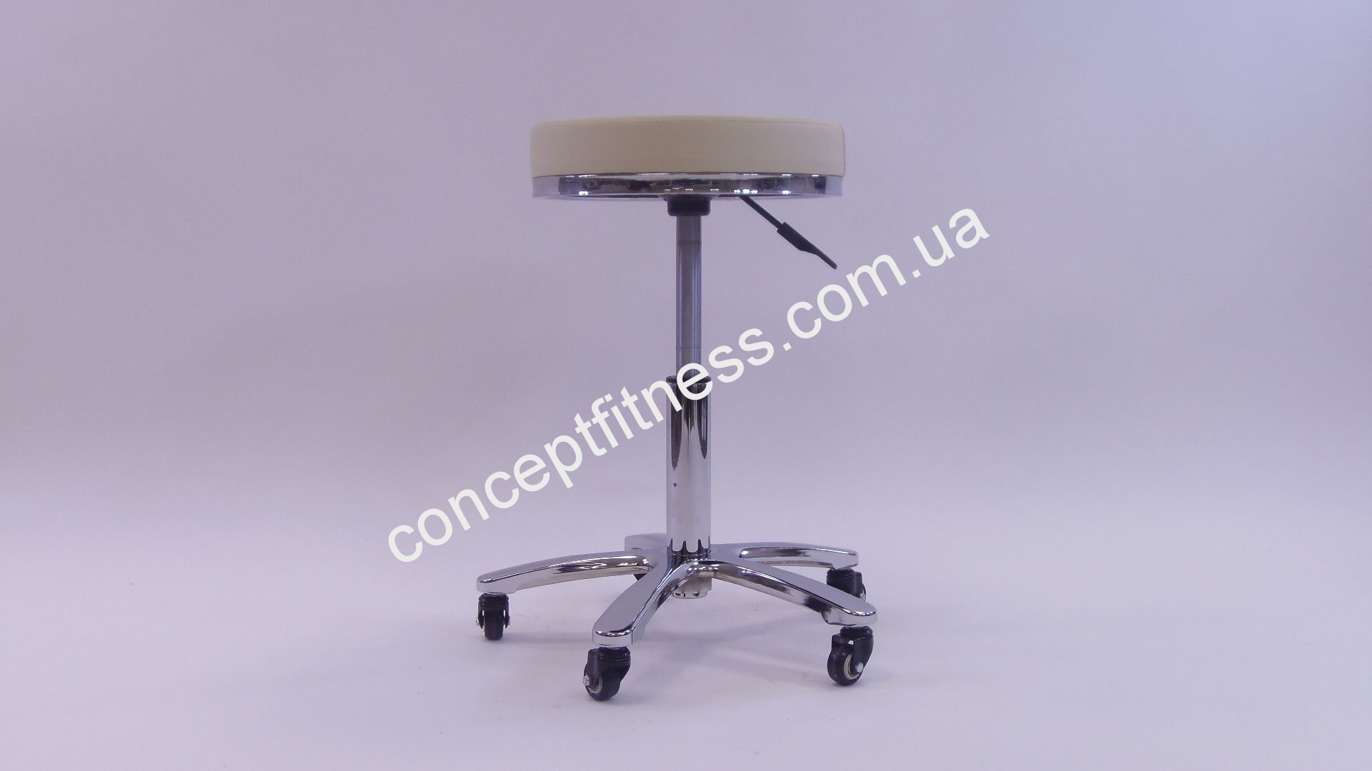 Високий стільчик для косметолога CH-845A, АСФ змінює висота натисканням на бічну ручку, а маневрені колеса значно полегшують переміщення по кабінету. Модель відрізняється стійкістю, що не перекидається, займає мінімум місця в приміщенні. Оббивка представлена в бежевому і білому кольорі, займається профілактикою поперекових болів, спини. Стільчик з пневматичним підйомником, хромованим підставою, діаметром 50 см, створений для справжніх професіоналів.