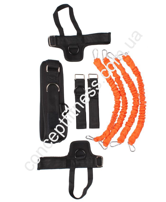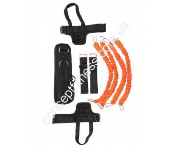 Чудовий, спортивний інвентар ЛайвАп Трейнінг Кіт чорно-оранжевого кольору включаючи в себе чотири еспандера з карабінами, мішечком на застібці, двома напульсниками, поясом для фіксації карабінів. До напульсники допомогою карабінів фіксуються еластичні еспандери для занять фітнесом, гімнастикою, аеробікою.