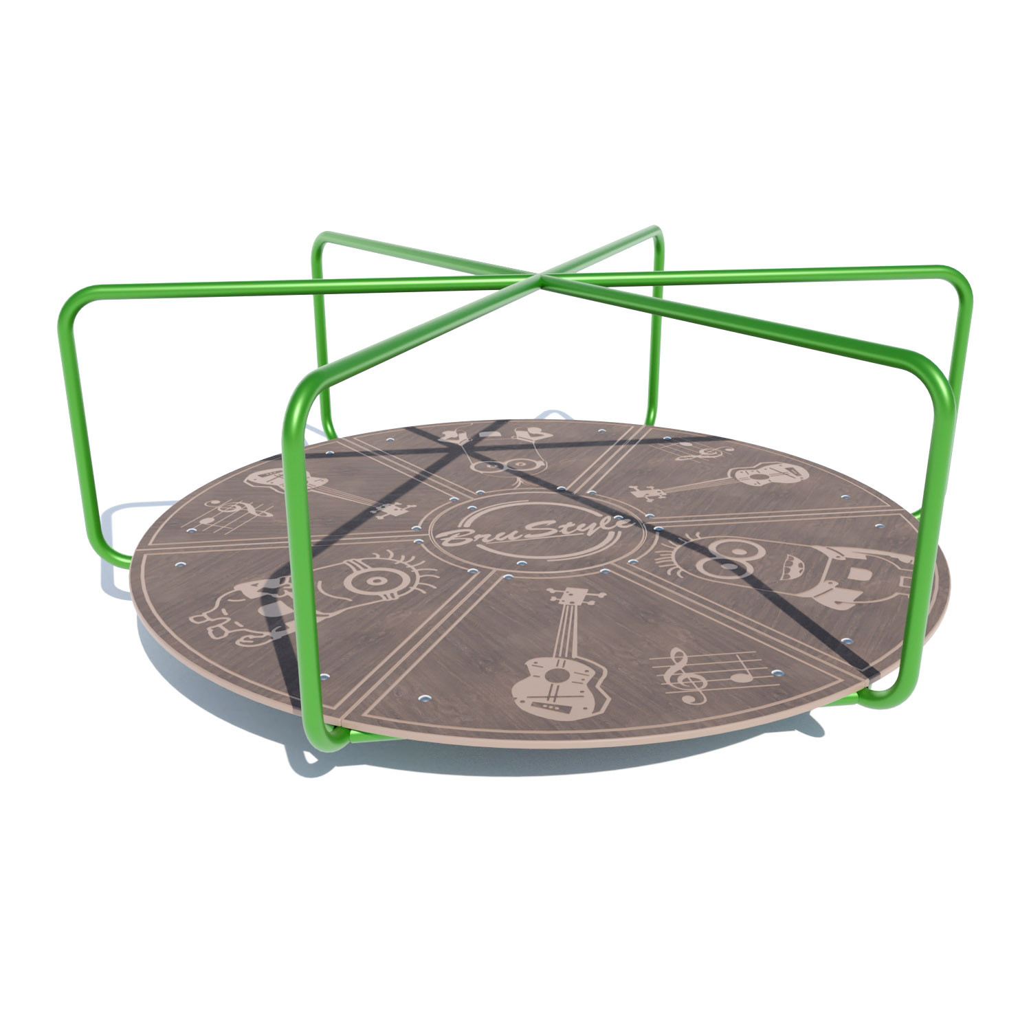 Інвентар на підшипниках для дитячих майданчиків, стоячи DIO305 вміщує 6 дітей одночасно, розвиває м'язові тканини рук, ніг, преса, а також координацію, рухливість, зміцнює вестибулярний апарат малюків. Міцність фіксації гарантують анкерні болти. Під час вправ слід дотримуватися техніки безпеки, не пускати дітей і не дозволяти зістрибувати з каруселі. Каркас виконаний з натуральної стали, обертається за допомогою підшипників, а підлогу каруселі ndash; дерев'яний, фанера. Каруселі заряджають позитивною енергетикою, сміхом, переживаннями на цілий день.