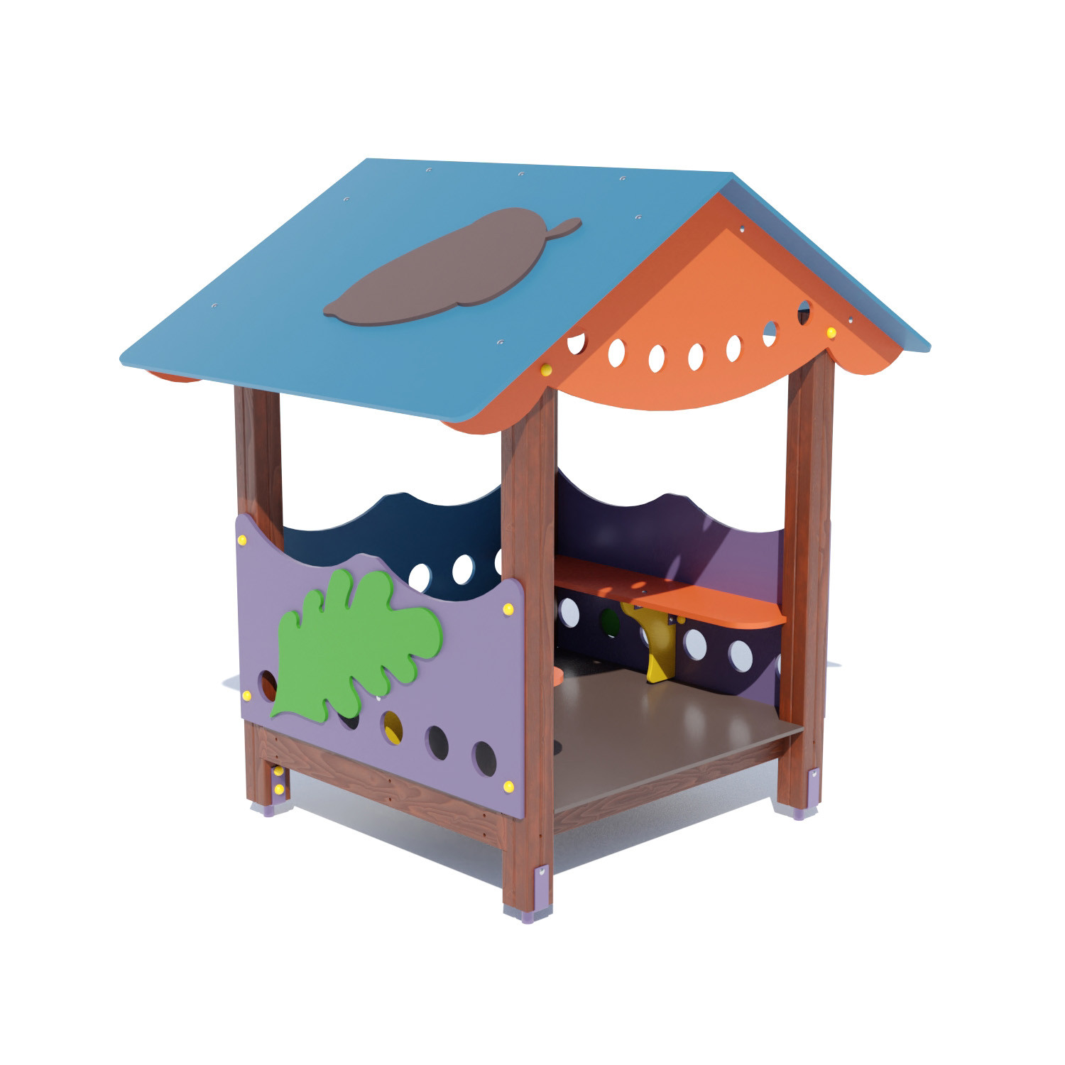 Будиночок Белочкін будинок DIO214 BruStyle встановлюється на спеціальні ніжки, які бетонуються або вкопуються для нівелювання перевертання, стійкості. Довгі лавочки припадуть до душі малюкам, на них можна пограти настільні ігри, скласти пазли, конструктор і багато іншого. Модель встановлюється в домашніх умовах, біля будинків, шкіл та садочків, базах відпочинку і готелях.