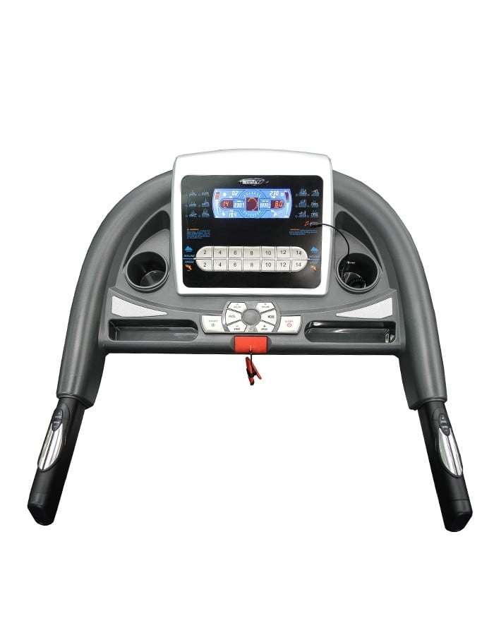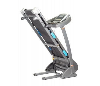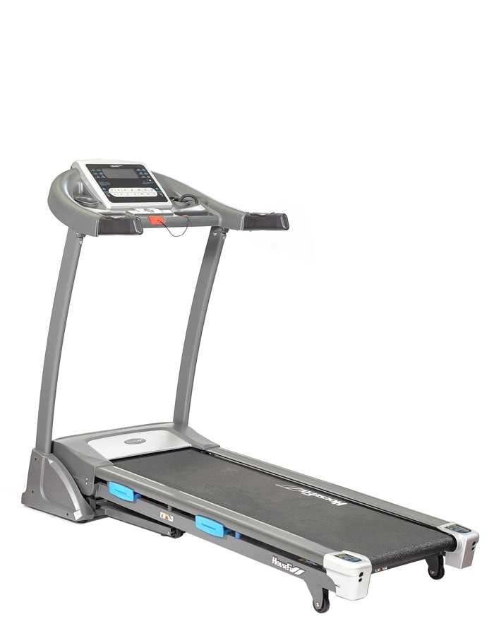 Бігова доріжка електрична HouseFit HТ 9166E, базуючись на основі потужного двигуна на 2 к.с., розвиває швидкість до 16 км /ч. Міцна рама здатна працювати з навантаженням до 120 кг максимум, при цьому власну вагу всієї конструкції тренажера - 62/72 кг. Його дизайн спроектований таким чином, щоб можна було отримати максимальну користь від тренування, не витрачаючи додаткових зусиль на настройку. Пропонуючи оснащення у вигляді бортового комп'ютера з ЖК-дисплеєм, робить крок вперед в майбутнє, допомагаючи тренуватися комфортно з контролем функцій нахилу, спалювання калорій, часу тренування, одометра і інших, а також зберігає в пам'яті 15 автопрограм, маючи 4 режими роботи. Дана конструкція має габарити 167х75х135 см. На окрему компліменту заслуговує складна система, що забезпечена гідравлічним поршневим замком, дозволяючи зберігати виріб з розмірами в складеному положенні 103х75х150 см.