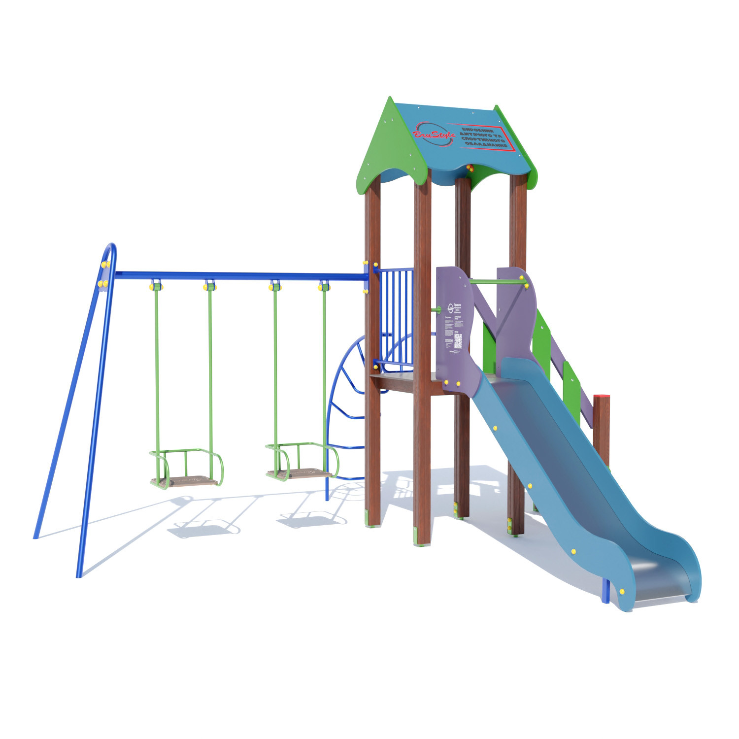 Устаткування для дитячих майданчиків, будинки, садки DIO701.2 розвиває витривалість, координацію, а батьки можуть посидіти і відпочити на лавочці. Комплекс оснащений двома гірками для швидкого спуску, трапом з перилами, лазом, а також широкої ручкою для спуску. Модель бетонується або закріплюється анкерними болтами зі штирями.
