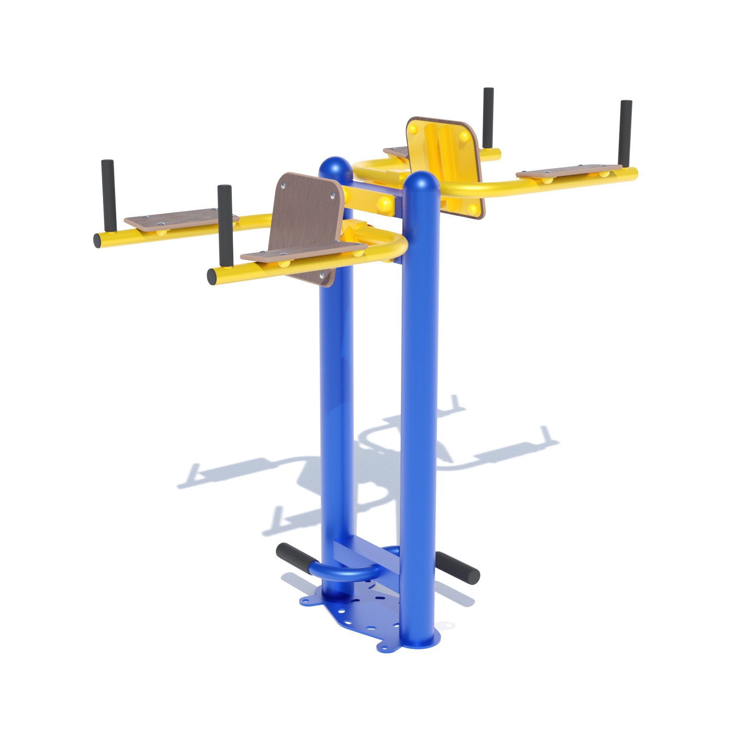 Вуличний тренажер упор для преса SG110 BruStyle провокує швидке спалювання жирів, а махи ногами до голови покращують пластику м'язів ніг і живота. Устаткування щільно фіксується до бетонної заставної, додаткове посилення створюють анкерні болти. Апарат тренує суглоби, рекомендований при відновлювальної терапії, має вагу майже 64 кг. Матеріалом виготовлення служить сталь, українського виробництва. Модель не займе багато місця на спортмайданчику, а систематичні заняття зроблять фігуру ідеальною. Інвентар підійде чоловікам і жінкам від 16-ти до 70 років, поверхня добре переносить вплив зовнішнього середовища, опадів, сонця. Тренажер пофарбований порошковою фарбою, в наявності вся необхідна документація, сертифікати якості та відповідності.