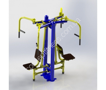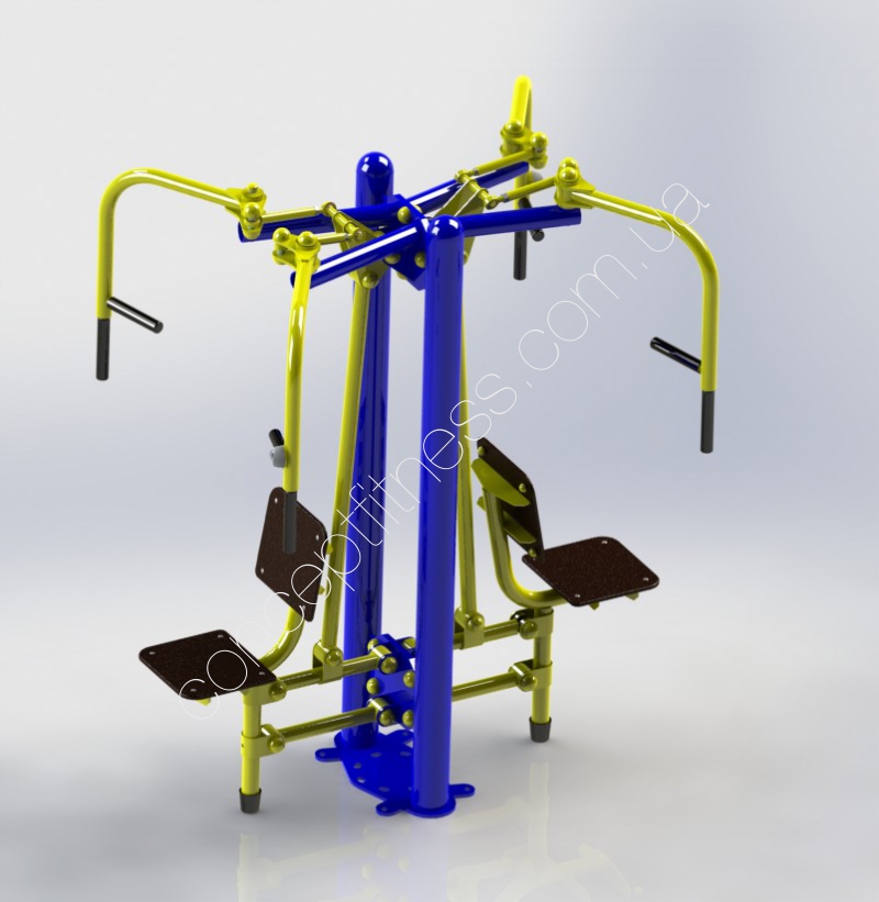 Спортивний комплекс Батерфляй вуличного призначення SG117 забарвлений декількома шарами порошкової фарби, а на додаток присутній документація, включаючи сертифікати якості та відповідності. На тренажері встановлені парні сидіння і ручки, рукоятки для фіксації. Ефективні тренування подарують гарний і стильний торс, а наявність моделі на спортивному майданчику долучить молодь до спорту, перетворить їх веселощі в оздоровчу фізкультуру. Для виробництва моделі була задіяна міцна сталь українського заводу.