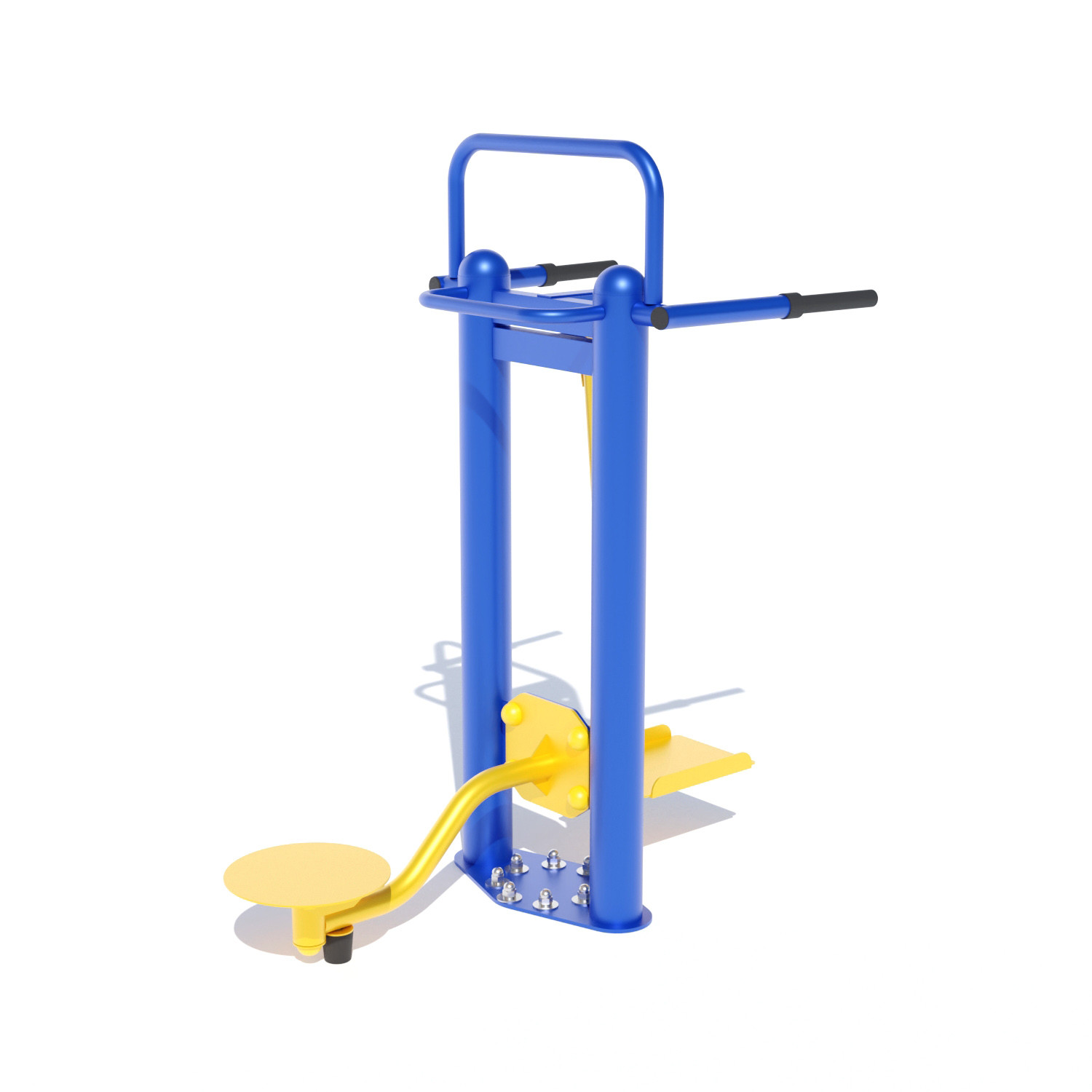 Вуличне обладнання для ніг SG126 виконано з якісного сталевого сплаву, витримує наскрізну корозію, пофарбований порошковою фарбою в синьо-жовтий відтінок. Заняття на свіжому повітрі благотворно впливає на тонус організму, підвищує координацію, динамічність і витривалість. Фіксація моделі здійснюється на заставну з бетону, анкера додатково посилять стійкість конструкції. Тренажер повертає втрачену фізичну форму, встановлюється на дачах, особняках, біля туристичних баз, шкіл і університетів.