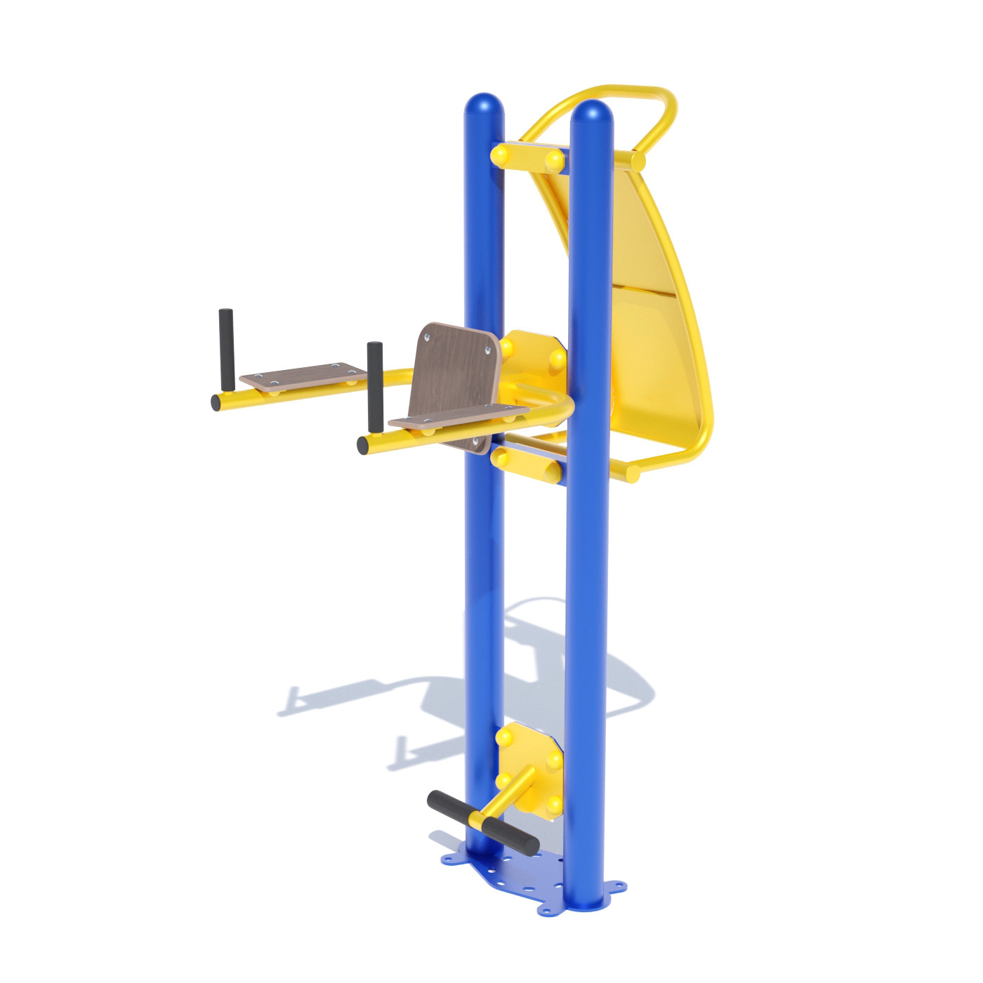 Вуличний тренажер Упор для преса SG127 BruStyle укомплектований ручками для фіксації, підлокітниками. Фіксація моделі здійснюється на заставну з бетону, анкера додатково посилять стійкість конструкції. Матеріалом тренажера служить сталь, що витримує корозію, пофарбована порошковою фарбою в синьо-жовтий відтінок. Вага моделі 70 кг, вона користується попитом у жаркий період року, наповнюючи тканини м'язів новим потоком кисню. Тренажер впливає на прямі і бічні м'язи, зробивши живіт підтягнутим.
