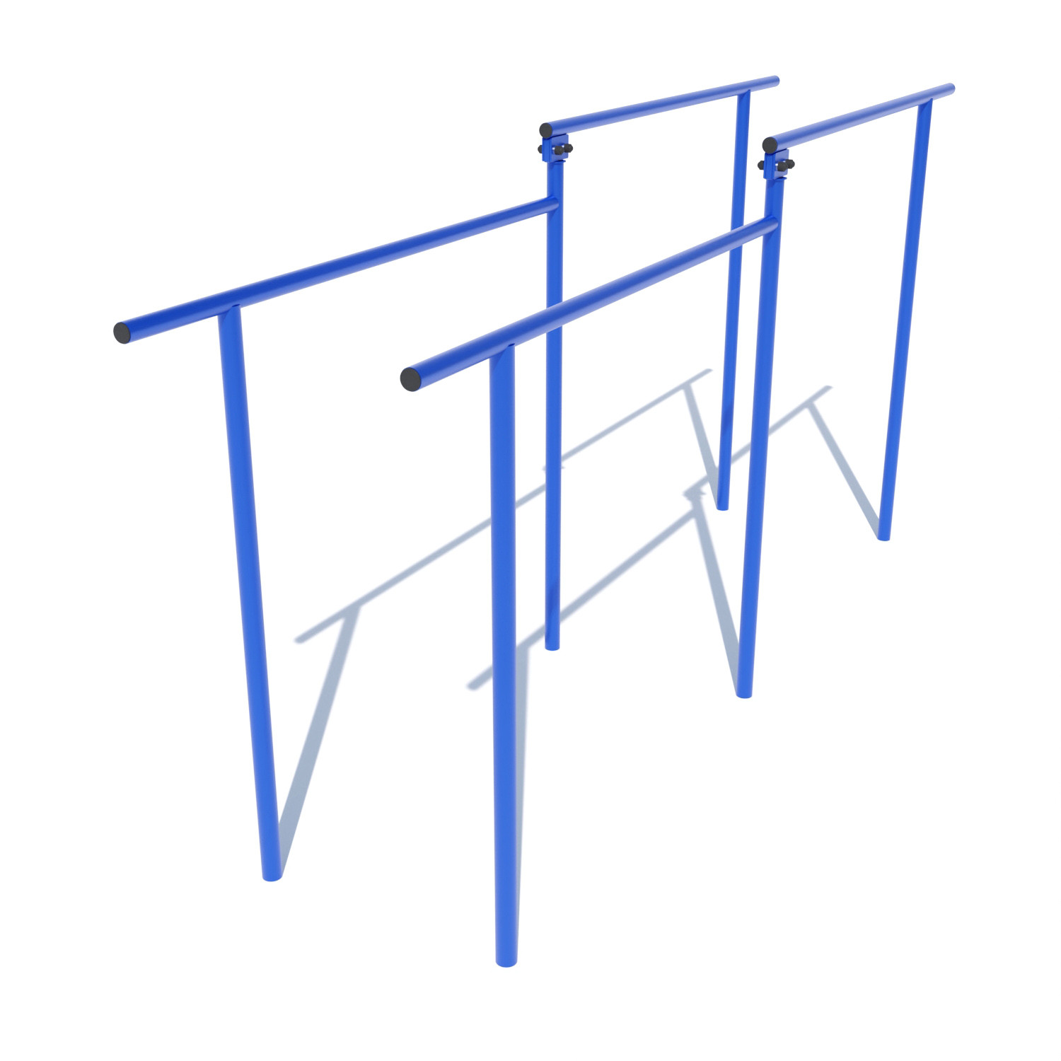 Гімнастичні обладнання для вулиць DIO627 Б-Стайл складається з двох секцій різної висоти, що допоможе швидше розвинути динамічність і витривалість. На моделі розвиваються трицепси, біцепси, плечовий і шийний відділ, поперек і спина, а також опорно-руховий апарат в цілому. Модель можна застосовувати в якості рукохіду, на ній можна здійснювати віджимання, підняття торса, зміцнення черевного преса, грудного і плечового відділу, а також передпліччя зі спиною. Вправи в дощ і снігопад рекомендується виконувати під наглядом дорослих, щоб уникнути травматизму і саден.