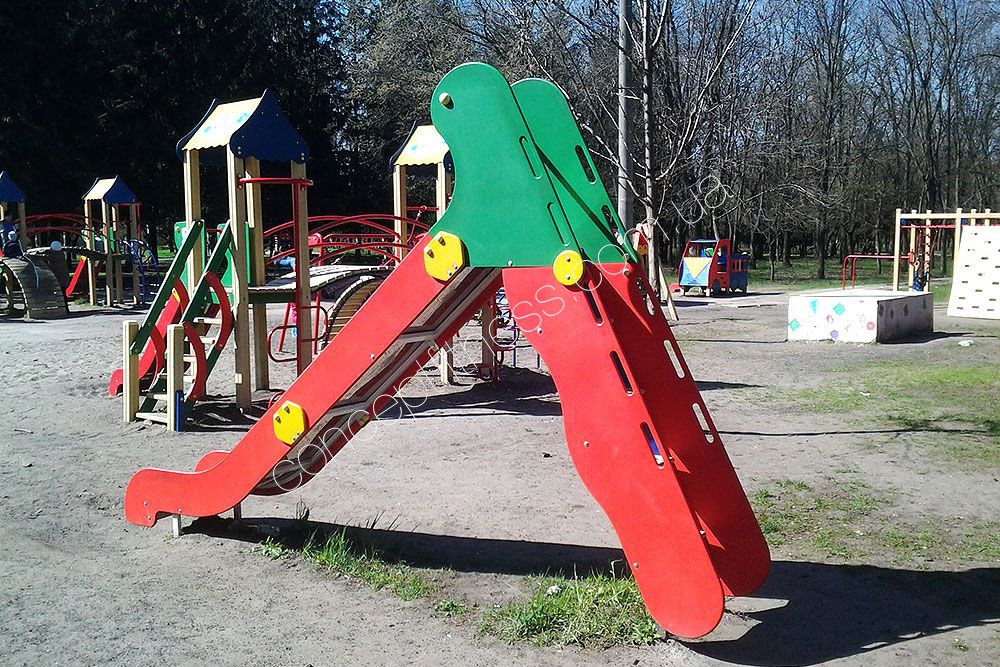 Дитяча гірка велика InterAtletika TE102 встановлюється на дитячих майданчиках, садках, школах, пансіонатах, базах відпочинку і дачах. Чи безпечно перебувати від гірки на відстані не менше 1,5 метра. Модель встановлюється на бетонну основу або гарненько бетонується щоб уникнути хаотичних розгойдування. Для виробництва барвистою гірки задіяли міцний дерев'яний брус, фанеру і тонколистовий метал.