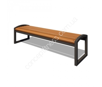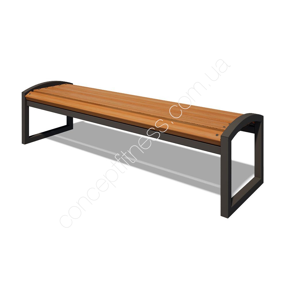 Дерев'яна лавочка без спинки Радіус Інтератлетика, арт. LP003.1 пофарбована порошковою фарбою, а бруси покрита лаком, вони захищають від вологи, снігу, прямих сонячних променів, блокує розвиток корозії. Модель проводитися з надійного, довговічного і сталевого профілю, підстава прикручується анкерами або бетонується. Садове обладнання успішно використовується дизайнерами, встановлюється на дачах, заміських будинках, громадських дворах, біля багатоквартирних будинків, а також зустрічається в парках, алеях, ігрових майданчиках.