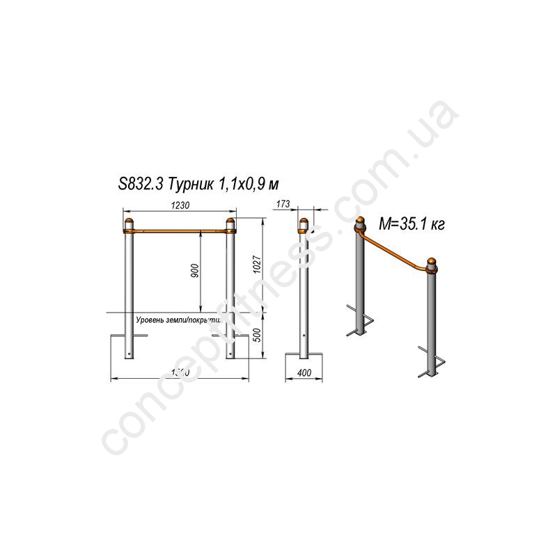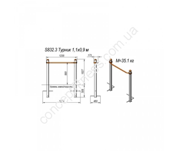 Одинарний вуличний тренажер Workout Інтератлетика, арт. S832.3 часто встановлюють біля стадіонів, приватних і громадських дворах, поблизу майданчиків і пансіонатів. Модель розвиває плечовий і шийний відділ, біцепси і трицепси рук, грудні і черевні м'язи, формує правильну поставу, зміцнює вестибулярний апарат. Інвентар витримує навантаження до 70 кг, важить 35 кг, розроблений для здійснення безлічі гімнастичних вправ і трюків.