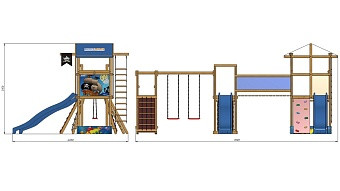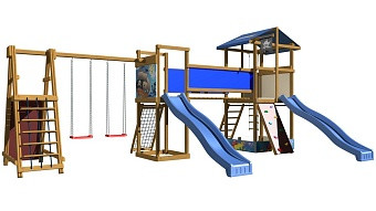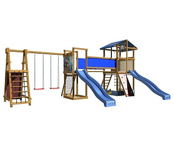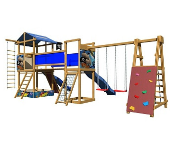 - Вбудована пісочниця, дитячий будиночок із дахом, гладіаторська сітка, скалодром, місток та качелі – максимум можливостей для гри.