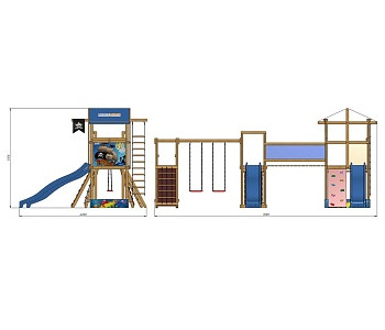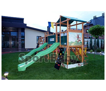 SportBaby-12 – це великий дерев’яний ігровий комплекс, що поєднує спортивні та розважальні елементи для дітей різного віку. Майданчик розрахований на кількох дітей одночасно, сприяє фізичному розвитку, активному відпочинку та командним іграм просто неба. Ідеально підходить для великої дачної ділянки чи подвір’я приватного будинку.
