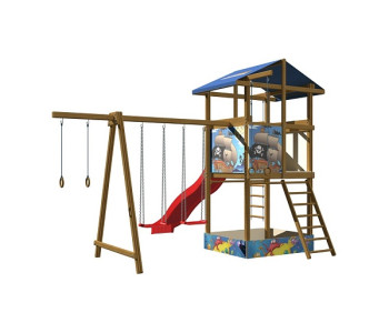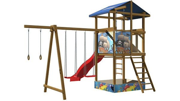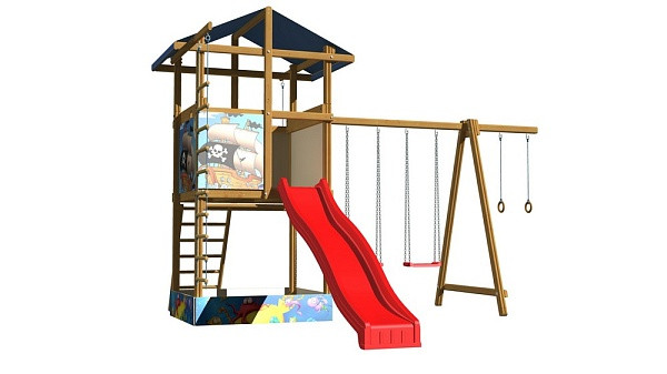 Розвиваюча дитяча площадка СпортБебі, модель СпортБебі-8 складається з гімнастичних кілець, вежі з пісочницею, двох качель, піратської сходи, гірки для крутого спуску. Невеликі габарити дозволяють встановити майданчик абсолютно на будь-якій ділянці, не маючи практичних навичок і спеціальних інструментів. Присутність подібного комплексу привчить малюків до фізкультурним занять, зміцнивши тим самим основні м'язи тіла. Модель витримує хороше навантаження, вміщуючи одночасно декількох непосид. Дерево покрите спеціальною фарбою, а склад блокує потрапляння вологи, розвиток вогкості і продовжує експлуатаційні характеристики.