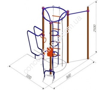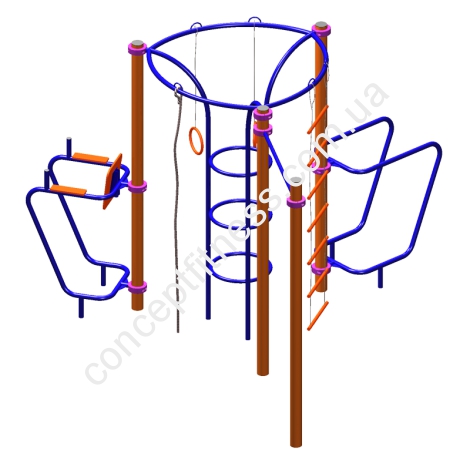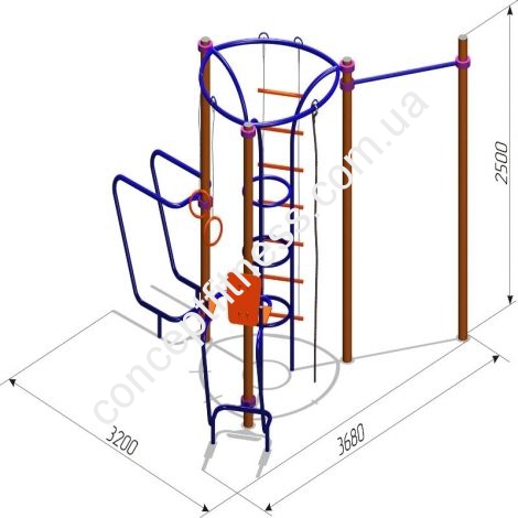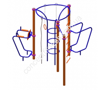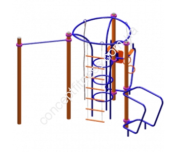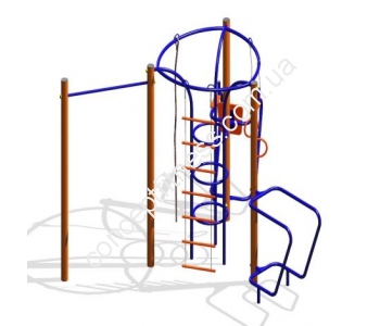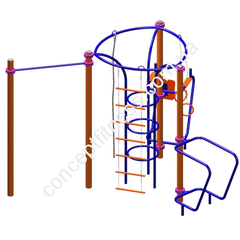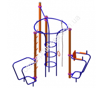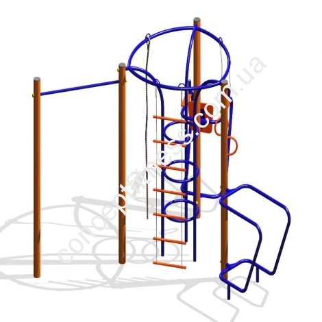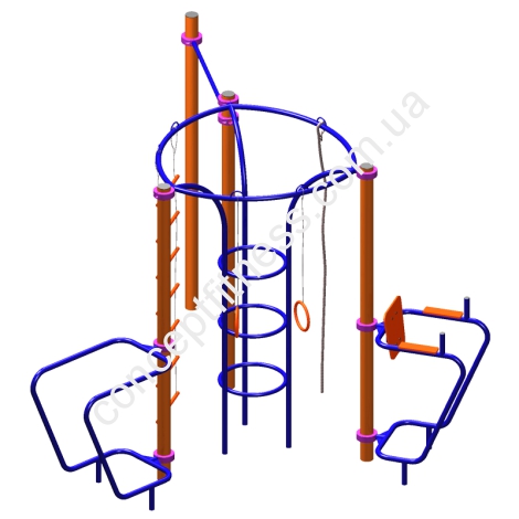 Міні вуличний спортзал Елефант, артикул КГ-07 порадує дітей канатом, кільцями, брусами для преса і підняття ніг, сходами пірата, турніком, бічними рукоходами і іншим інвентарем. Відвідуючи комплекс, малюки розвивають руки, ноги, прес, поперек, зміцнюють суглоби і опорно-руховий апарат. Устаткування використовується для відновлювальних і тренувальних цілей. Комплекс забарвлений порошковим складом, проводиться з надійного і якісного сталевого сплаву.