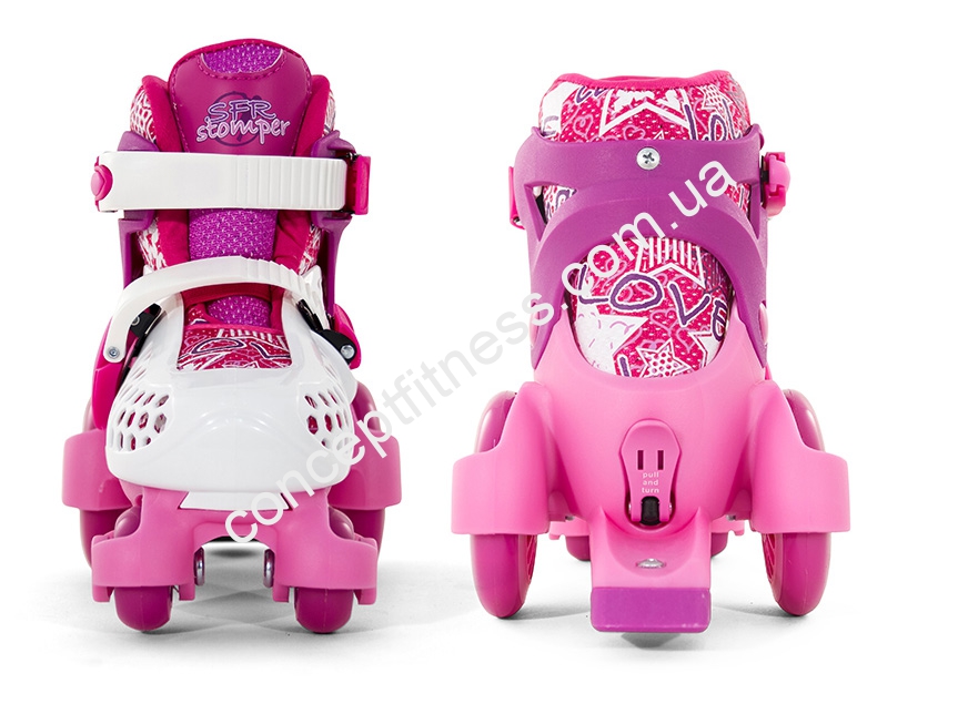 Ролики для самих маленьких принцес СФР Стомпер, артикул 344905 оснащені двухосной платформою, передня злегка звужена, що гарантує чудову стійкість на поворотах. Роликові ковзани має низький центр тяжіння, комфортний держатель для голеностопа з м'якого матеріалу, ортопедичну устілку, що миється ботінок.