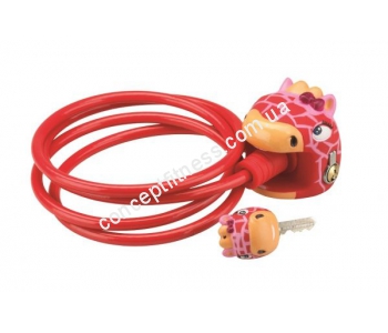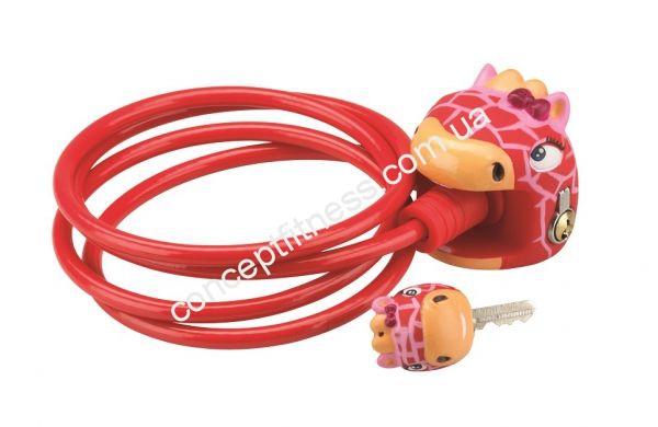 Міцний замок-жираф Крейзі Сафеті, артикул 240105-20 має довжину 120 см, виконаний в рожевому кольорі. Трос обтягнутий м'якою гумовою опліткою, всередині знаходяться сталеві прути. Накладка в формі жирафа проведена з м'якого пластику, нагадує відомих мультяшних персонажів.