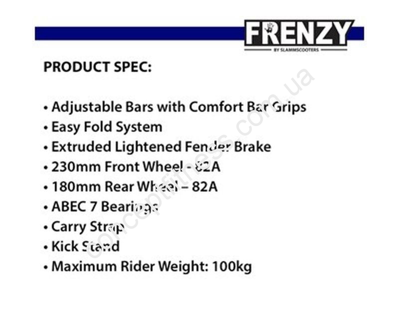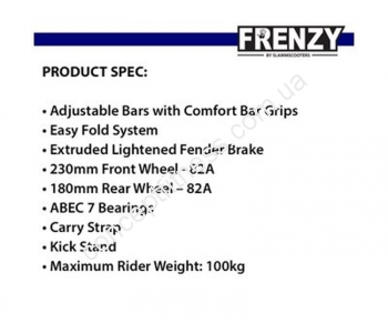 Складаний самокат Frenzy Recreational FR230 з м'якими, поліуретановими колесами, твердістю 82А. На такому скутері можуть їздити дорослі і діти, передбачений регульований кермо, маневрені колеса, підставка і ножні гальма. Самокат підійде для спортивних і екстремальних умов, характеризується розкішною обробкою. На ньому можна відправитися на прогулянки, роботу, влаштувати веселі змагання.
